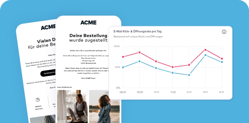 Die hohen Öffnungs- und Klickraten der Versandnachrichten und der eigenen Sendungsverfolungsseite nutzt du als Recruitingkanal, für das Bewerben von Events, zur Steigerung deiner Newsletteranmeldungen, sowie für spontane Zusatzkäufe.