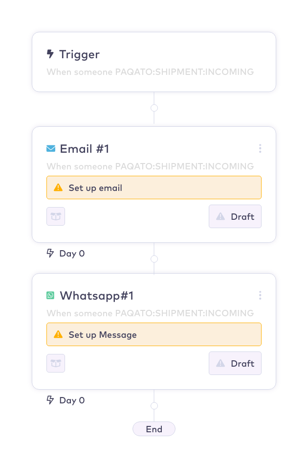 Egal, ob planmäßig, verspätet, oder beschädigt – mit PAQATO und Klaviyo kannst du hochkomplexe Kommunikationsflows erstellen und sowohl positive als auch negative Status-Updates proaktiv kommunizieren. Dabei kannst du Kunden nicht nur mit E-Mail-Kommunikation begeistern, sondern auch mit Push-Notifications via WhatsApp. Individuelle Fallunterscheidungen und erweiterte Automatisierungen sorgen dafür, dass du immer die richtige Nachricht zum richtigen Zeitpunkt versendest.